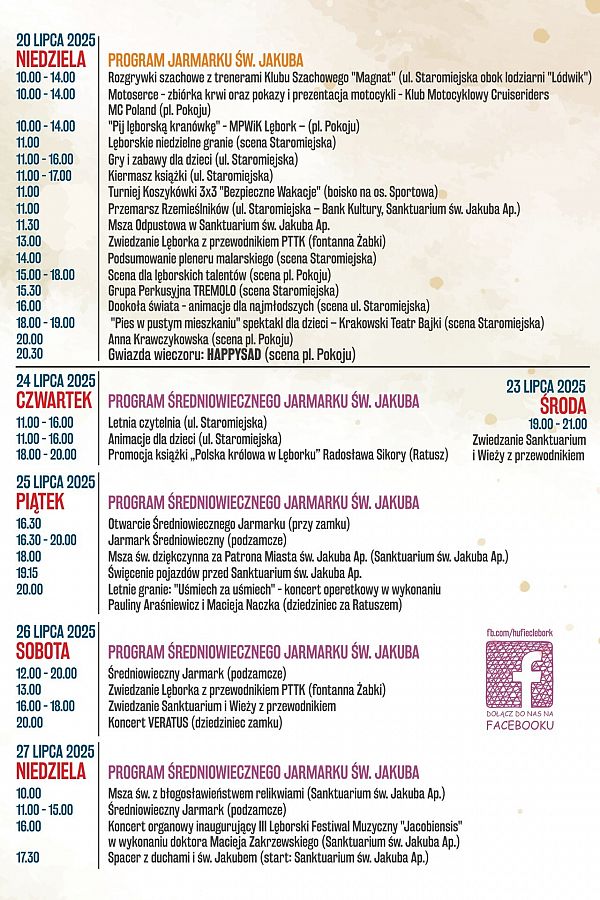 Startujemy z programem Jarmarku św. Jakuba 2025! Czas odkryć, co szykujemy na najgorętsze dni tego lata w Lęborku! Przed Wami oficjalna premiera programu Jarmarku św. Jakuba – wydarzenia, które połączy tradycję z nowoczesnością, historię z muzyką, średniowiecznych rycerzy z gwiazdami sceny i energią młodego miasta.